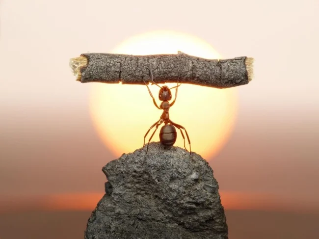 This close-up photo shows a common ant performing an incredible biomechanical feat. The little insect is carrying a piece of wood that weighs 50 times more than itself. The image reveals the epic struggle for survival that ants wage on a daily basis.
