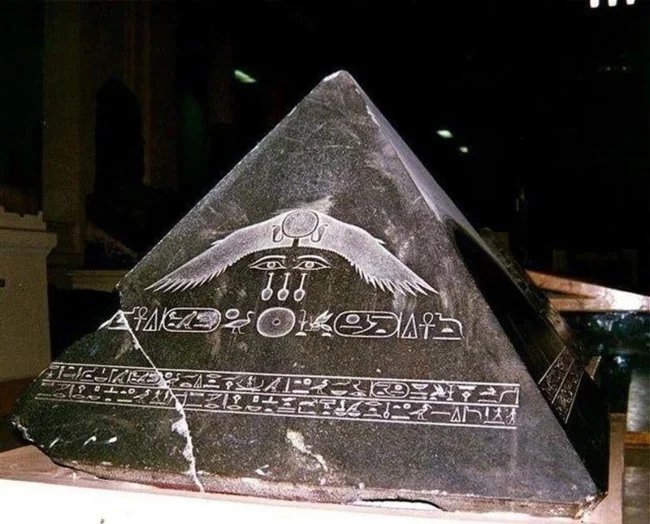The photograph shows a rare artifact - a pyramidion (the top stone of a pyramid), found in the Dahshur region. This is one of only four known surviving examples, dating back to the era of Pharaoh Amenemhat III (19th century BC).