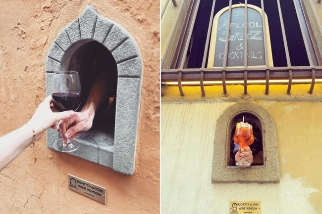 These small windows, known as "buchetti" (buchetti del vino), were used by winemakers in Florence and Tuscany as early as the 17th century to sell wine during plague epidemics. Their design allowed for minimal contact: the customer knocked on the window, received a bottle of wine, and left money on a special shelf. In 2020-2021, some bars and wineries in Italy (especially in Tuscany) began using them again for contactless sales of food and drinks due to COVID-19.