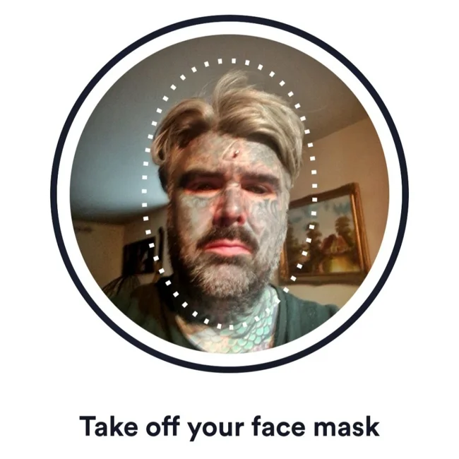 Age verification system by face mistakes his tattoo for a mask and does not provide access to adult content.