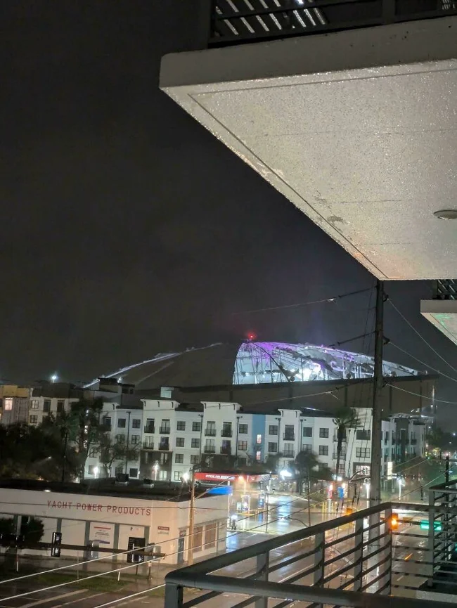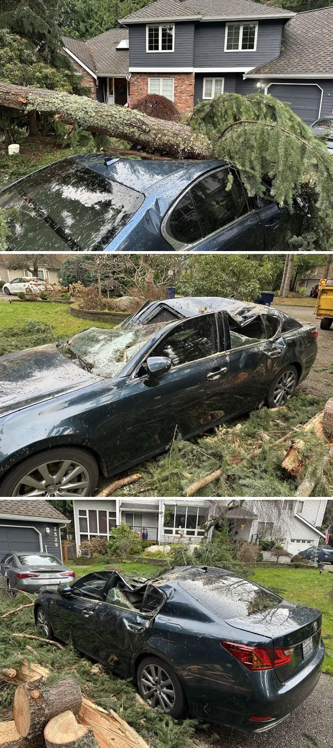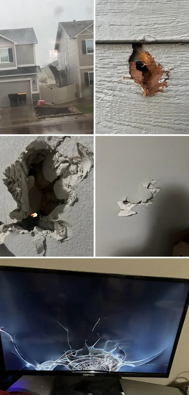 16. During a storm, the rope holding up the neighbor's trampoline broke. A safety net post crashed through our bedroom wall and hit our TV