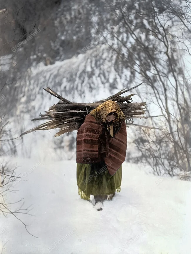 A Dakota woman carries firewood on her back through the snow. USA, 1909.