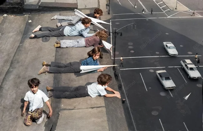 Children launch paper airplanes from the roof of a building in New York City, 1968.