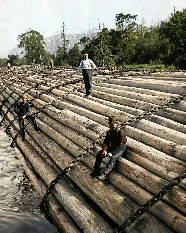 Loggers float timber down the Columbia River in Oregon, 1910.