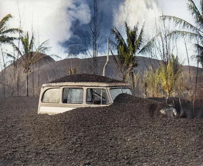 A car in Kapoho, Hawaii, is almost completely buried by pumice from a nearby volcano, 1959.