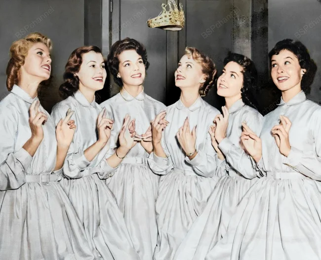 Jeryl Johnson, Hilly Merritt, Gretchen Foster, Carol Tobey, Myrna Fahey, and Maggie Pierce cross their fingers under the crown in 1955. Beer has a reputation for being a working-class drink, but from 1940 to 1965, New York-based Rheingold Beer made the beverage synonymous with elegance, beauty, and modernity. Their Miss Rheingold contest attracted thousands of applicants each year, and the winner represented Rheingold in advertising and at personal events throughout the year. In 1956, Hilly Merritt was the lucky winner.