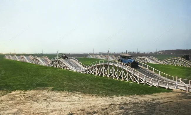 It was designed and built by Harry Roxx of Los Angeles, who called his creation an "auto-thriller." The unique undulating design allowed drivers to take a thrilling ride 2,400 feet (about 730 meters) long. The road, shaped like the letter "U," was designed to allow cars to reach speeds of up to 40 miles per hour (about 64 km/h). At the same time, individual "humps" on the track reached a height of three meters, creating the effect of a real roller coaster on wheels. Plastic house exhibit at Disneyland, 1950s.