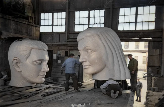 Assembling an advertising structure for the Bond department store. New York, USA, 1948.