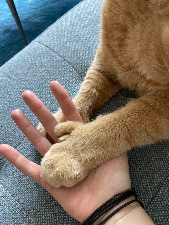 "In my palm is an impressive-sized paw of my polydactyl cat named Einstein"