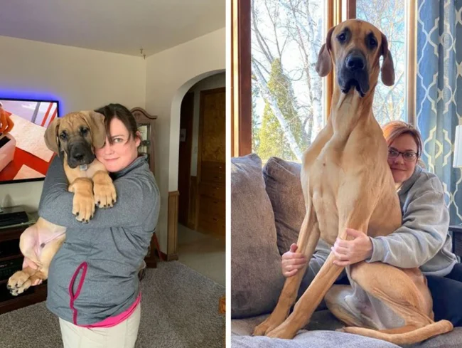 "My dog in the photo on the left is 12 weeks old, and on the right is a year and a half old later"