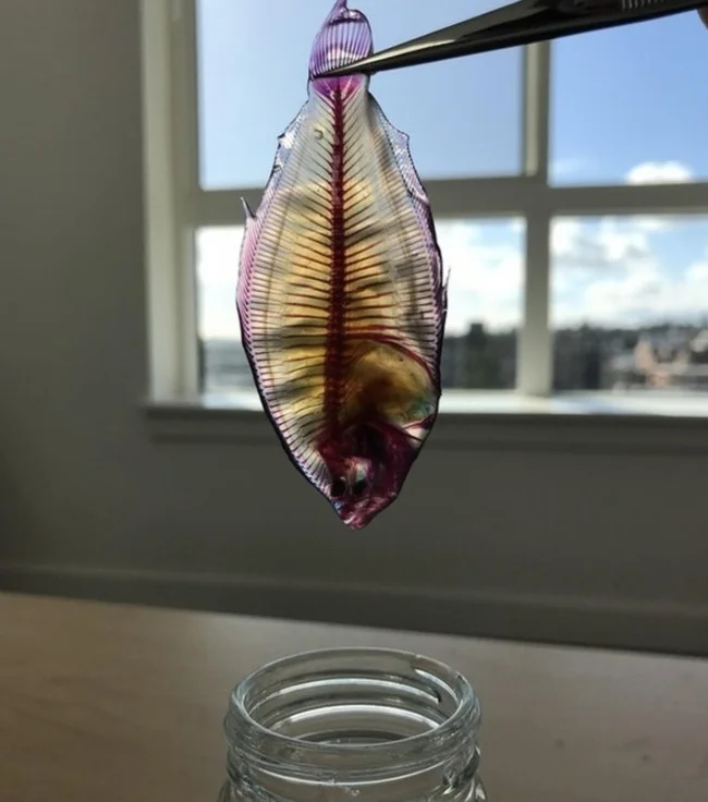 A fish that has gone through a chemical process. The cartilage turned blue, the bones turned red, and the skin and organs became transparent ![]()