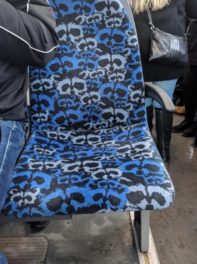 The coloring of the seat on the bus looks like a bunch of raccoons