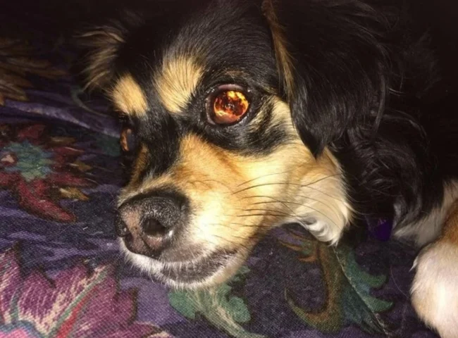 A blind dog. But when you take a picture of it with a flash, it seems like lights are burning in its eyes