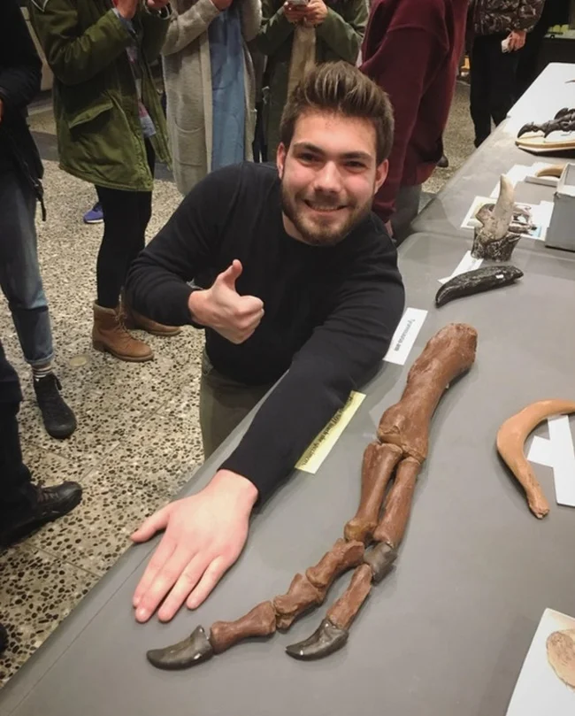 The short legs of a Tyrannosaurus are only slightly longer than an arm person