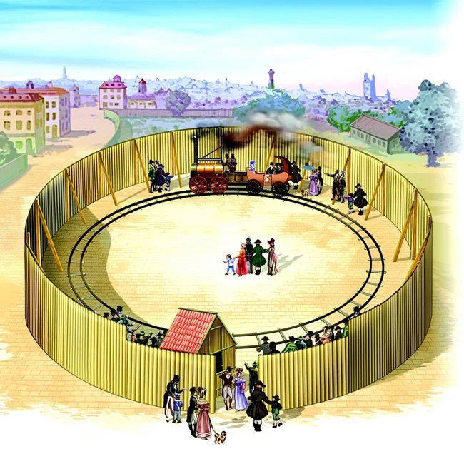 In 1808, Trevithick came to London to popularise the railways. He built a demonstration track with a diameter of 30 meters, where a steam locomotive pulled carriages, like on a fairground carousel. Despite the advertising purposes, the inventor surrounded the track with a high fence, hiding it from prying eyes. Accordingly, only those who had bought a ticket could watch. Trevithick called it the "Steam Circus".