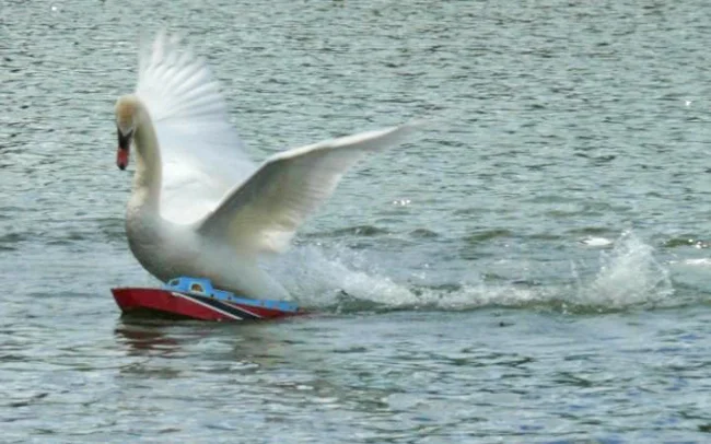 A photo of the very swan that sank model boats. Its owner spent more than six months creating it!