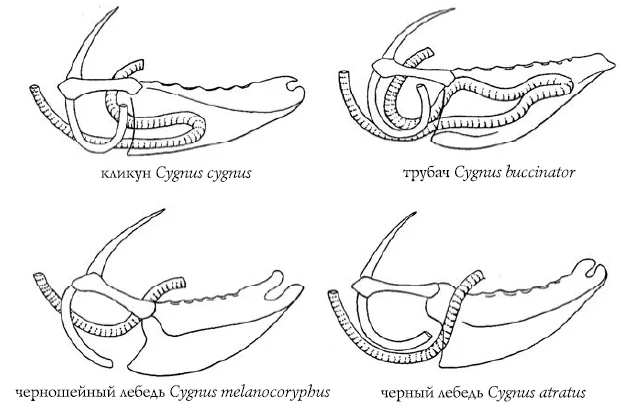 The trachea of the mute swan is structured in the same way as the trachea of the black swan. In this case, pay attention to the hook that the trachea makes in the whooper and trumpeter.