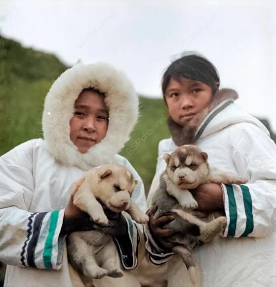 Two Inuit (Eskimo) girls with puppies in their arms. Northern Canada, 1951.