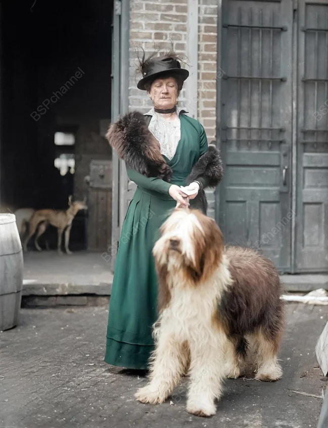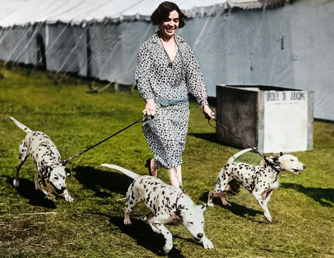 Three Dalmatians and their happy owner after they won first prize at the 1929 London Dog Show in London.