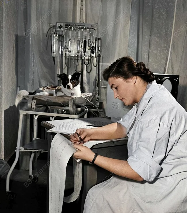 Physiologist Ada Kotovskaya prepares the dog Laika for a flight on the 2nd artificial satellite of the Earth. It took place on November 3, 1957.