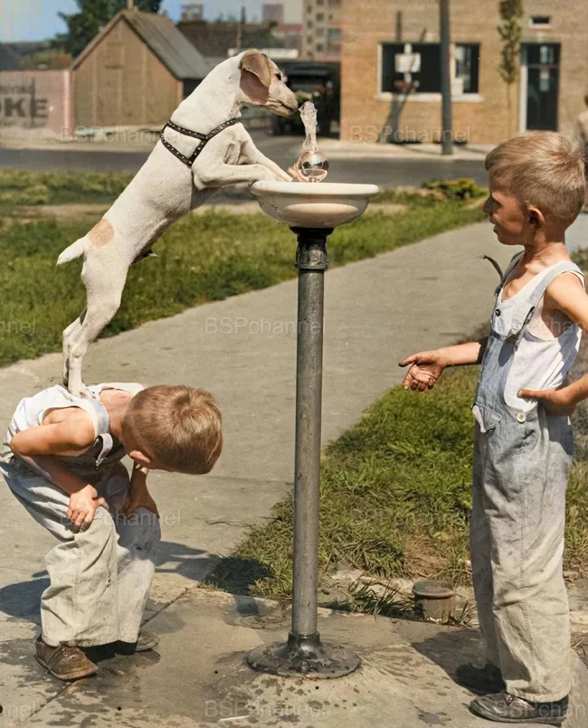 A boy helps his friend get a drink of water. Wisconsin, USA, 1940s.