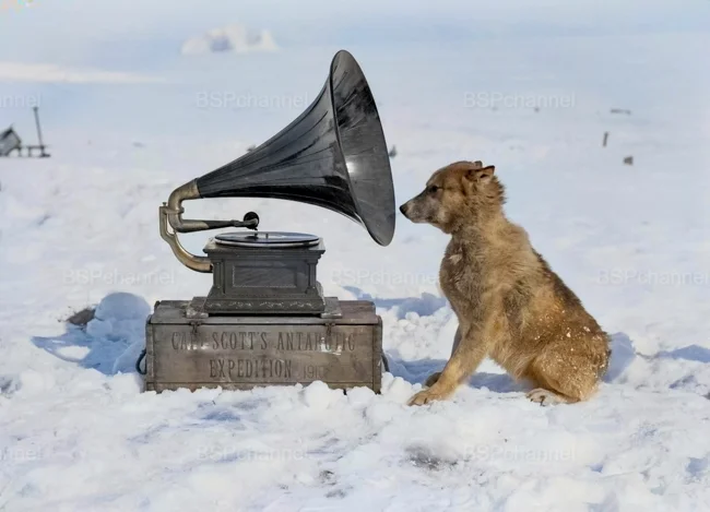 Sled dog and gramophone. Terra Nova Expedition, 1910-1913.