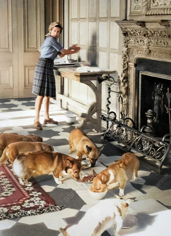 Queen Elizabeth II feeds her corgis in Balmoral, Scotland, 1976.