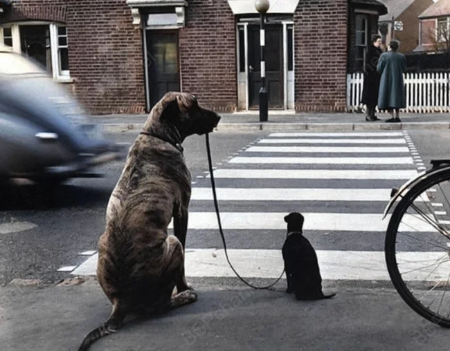 A Great Dane holds the leash of his smaller companion as they wait by the side of the road during a dog training class run by dog trainer Barbara Woodhouse. UK, 1954.