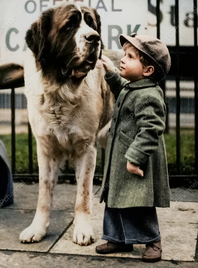 A boy with his St. Bernard at the Crufts dog show. London, 1950.