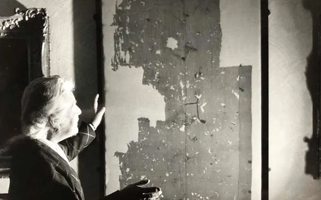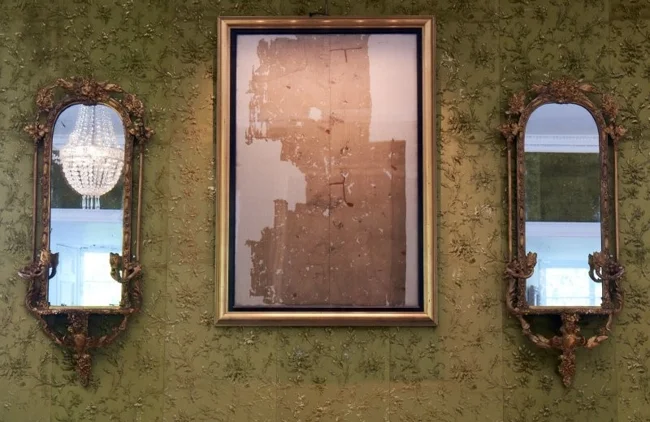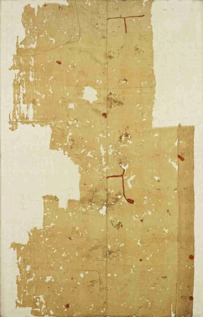 The banner is about 45 centimeters long, made of tan silk with red dots and was once decorated with gold crosses. In the 20th century, it was placed in a sealed display case for preservation.