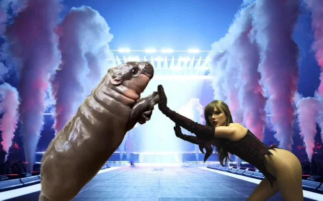 Taylor Swift high-fives the famous pygmy hippopotamus Mu Deng