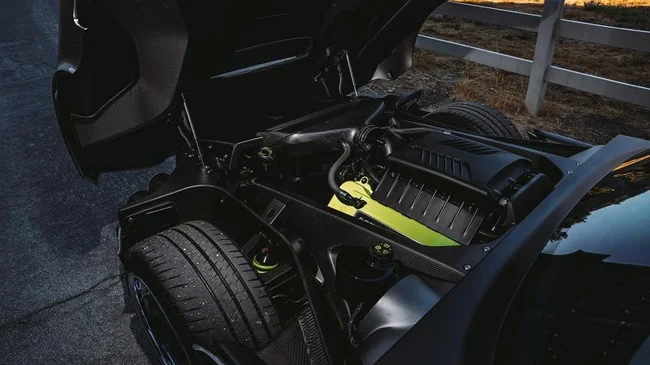 The original engine has been replaced with a modern V8 from Ford Performance, which, with a volume of 5 liters, develops 805 horsepower. This was achieved by equipping the unit with a large Harrop supercharger, an alternative control unit from Holley, modified manifolds and a number of other improvements. The engine is supplied with a manual transmission and a rear axle from Strange Engineering.