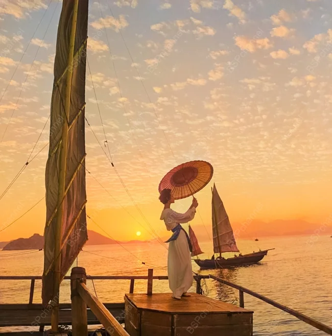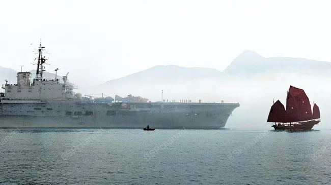 Two eras met on the high seas - the formidable British aircraft carrier HMS Centaur and an elegant Chinese junk. A junk is a traditional Chinese sailing vessel, one of the most recognizable symbols of Asia and China's maritime history. The junk is easily recognized by its raised stern and bow, as well as by its characteristic rectangular sails, which resemble a fan with their woven bamboo slats. These sails are very effective and allow the vessel to maneuver well even in headwinds. The vessel sails on rivers and near the coastline. Such boats are still very popular and are widely used in Southeast Asia.