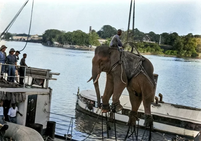 Loading elephants. German ethnographic expedition of Egon von Eickstedt. Andaman Islands, 1926-1929.