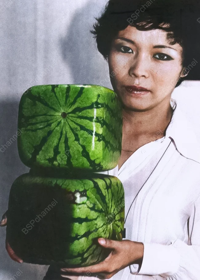 A display of cubic watermelons by designer Tomoyuki Ono. Japan, 1978.