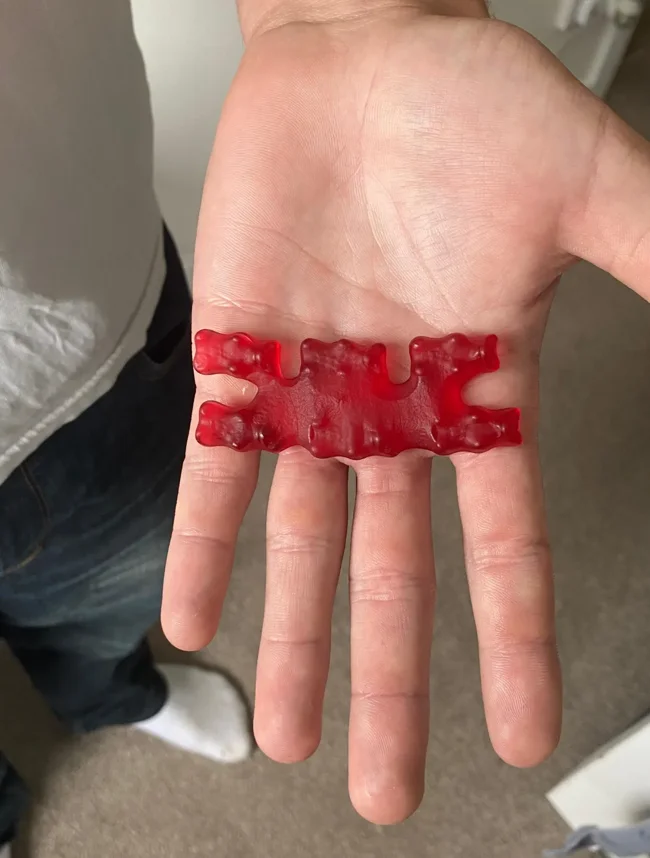 The bears were mostly ordinary, except for a group of six red ones. These were stuck together to form one oddly shaped piece. Owen, from Ashtead, Surrey, is sure that the confectionery anomaly was caused by some kind of manufacturing glitch.