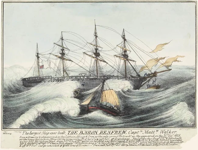 Meanwhile, a second similar vessel, the Baron of Renfrew, was under construction in Quebec. It was approximately the same length as the Columbus, but wider and deeper, increasing its weight to 5,880 tons. Its gross weight at launch was over 15,000 tons, including cargo; 2,000 tons of this amount were masts for the Admiralty—the largest ever shipped from Canada. After a perilous Atlantic crossing, the ship ran aground on the Goodwin Sands off Long Sand Head in the English Channel. When it became apparent that the vessel could not be refloated, the crew abandoned it. The Baron Renfrew soon broke apart, and its timbers washed up on the coast of France and Flanders.