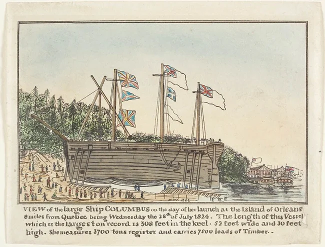 In 1824, Charles Wood traveled to Quebec to oversee the construction of the first one-day ship, the Columbus. Its dimensions were colossal: 91 meters long, 15 meters wide, and almost 7 meters high. The vessel weighed a staggering 3,690 tons—more than ten times the tonnage of an average ship. The ship was built with minimal expense. The hull was composed of thick, rough-hewn logs, uncaulked at the seams so they could be easily dismantled without damaging the wood. The bottom was wider than the deck, giving the entire vessel a clumsy and crude appearance. According to a correspondent for The Times, "The Columbus was a colossal mass of timbers, hammered together for commercial purposes, without the slightest regard for beauty and with almost no regard for the principles of naval architecture."