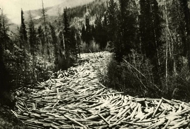 Logs await the spring floods to be carried into the Columbia River in the Canadian province of British Columbia.