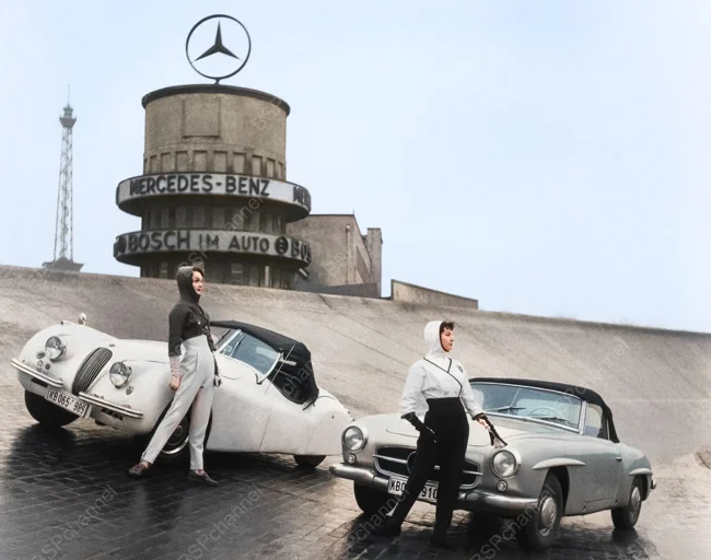A Jaguar XK120 and a Mercedes 190SL at the famous AVUS racetrack. Berlin, 1956.