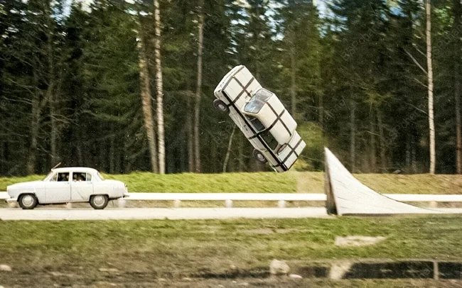 Rollover test of a ZAZ-966V "Zaporozhets" car, Dmitrovsky Proving Ground, Moscow Region, 1970.