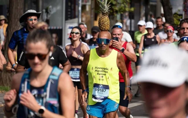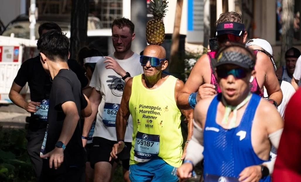 At the Berlin Marathon, 68-year-old (some sources say he's over 70) Moshe Leredfine ran the entire distance with a pineapple on his head. He covered the 42 kilometers in 5 hours and finished with the pineapple on his head.