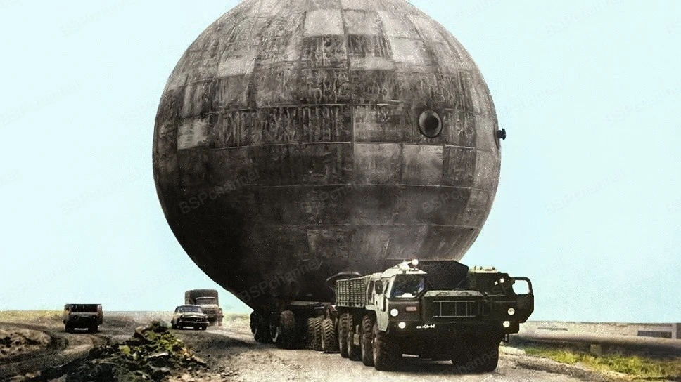 Towing a liquid hydrogen tank at Baikonur. The tank is pulled by a MAZ-7310.