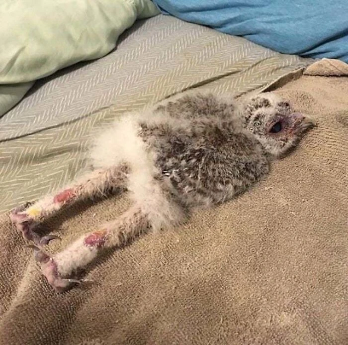 The reason for these strange sleeping positions in owlets is completely different, although it is also related to the general characteristics of vertebrate babies. The reason is that babies tire too easily. Their metabolism is fast, faster than that of adults, but most of their energy is spent on supporting rapid growth. At the same time, their brains are not yet able to calculate the body's energy reserves. Therefore, human babies, kittens, and owlets, fall asleep at the most random moments. They don't have the time or attention span to even find a comfortable position. Especially if they feel safe and confident that no one will bother them!