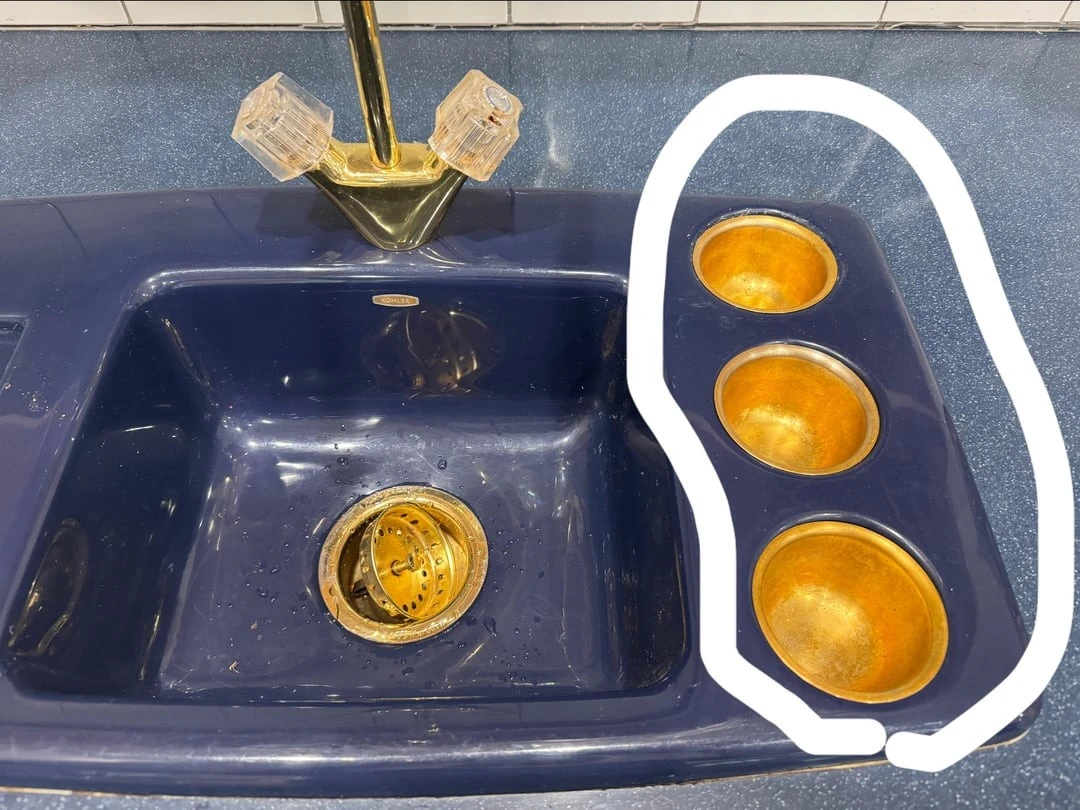 2. A sink in a 1970s house with an additional section with three small, removable brass bowls