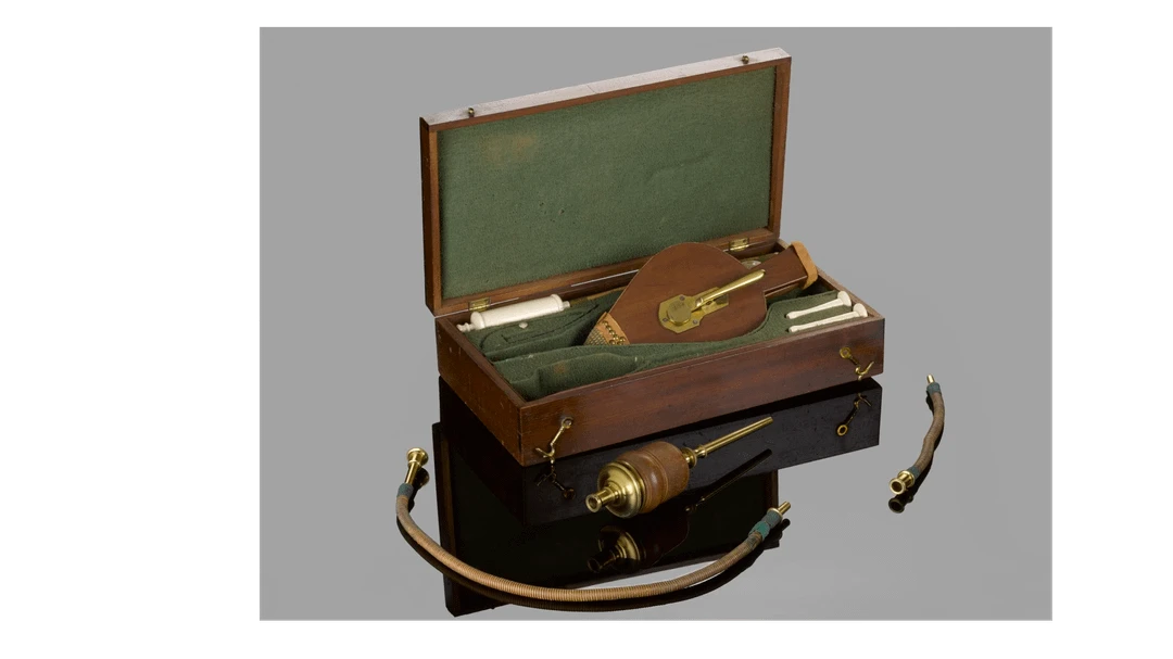 A tobacco enema resuscitation kit, popular in the 18th and 19th centuries. One of the first known references to the use of tobacco enemas dates back to 1746. When a man's unconscious wife was pulled from the Thames, a passing sailor gave the man his pipe of tobacco and ordered him to give her an enema, after which the woman allegedly quickly regained consciousness. Tobacco enemas were regularly used at that time to revive drowning patients and treat headaches, convulsions, hernias, typhoid fever, and cholera. This practice remained in use until medical research in 1811 revealed that tobacco smoke had negative effects on the cardiovascular system, leading to a decline in its popularity.