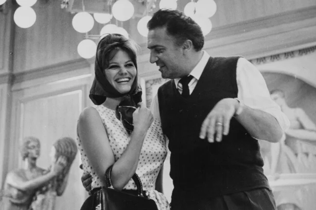 Actress Claudia Cardinale and director Federico Fellini on the set of "8 1/2," 1963