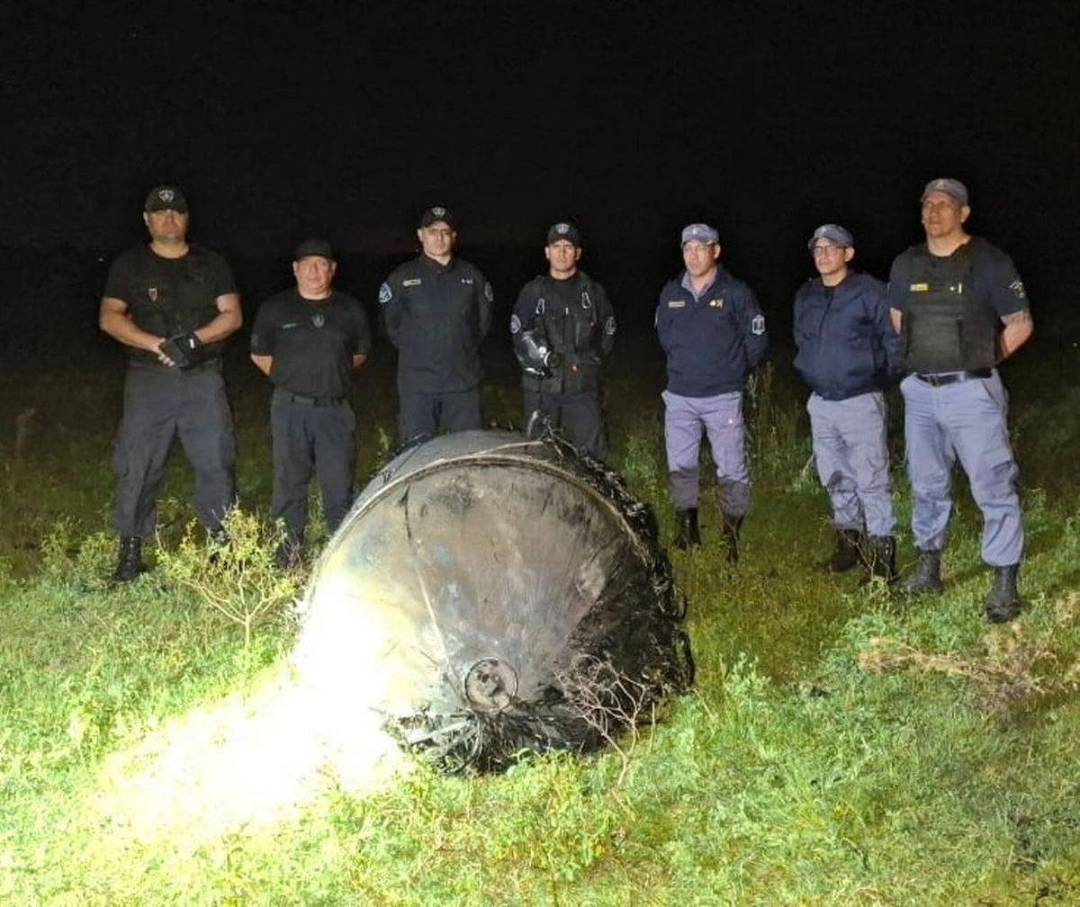 A large carbon fiber cylinder, approximately 1.7 meters long and 1.2 meters in diameter, was found on the ground in Puerto Tirol, Argentina.