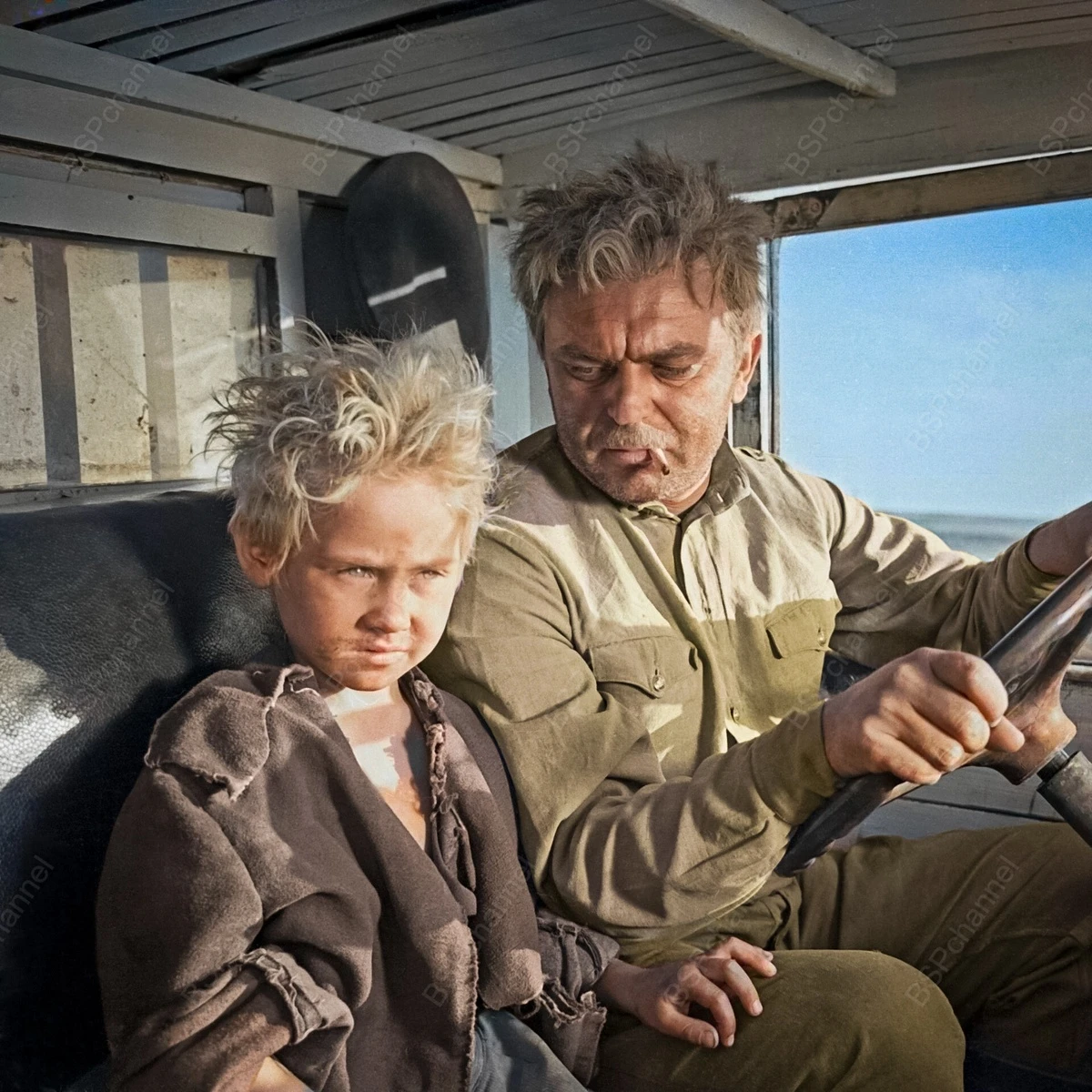 Still from the film based on Mikhail Sholokhov's novella of the same name, "The Fate of a Man." Sergei Bondarchuk's directorial debut. Bondarchuk stars as Andrei Sokolov, and Pavel Boriskin as Vanyushka, 1959.