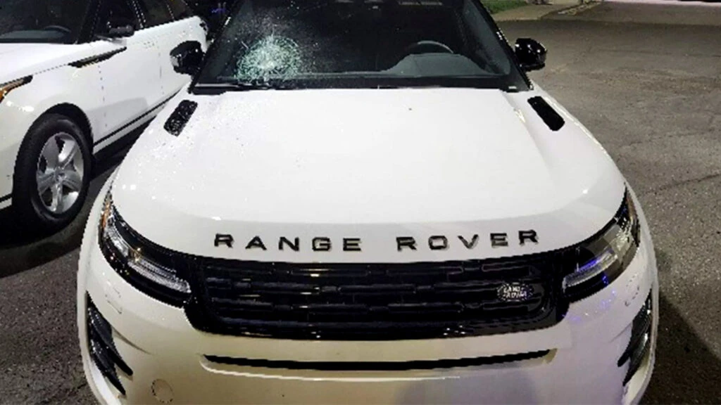The Spokane Land Rover dealership had several cars parked outside at the time. Photos posted on social media show at least one white Range Rover Evoque with a shattered windshield and a Range Rover Velar with a shattered rear side window.